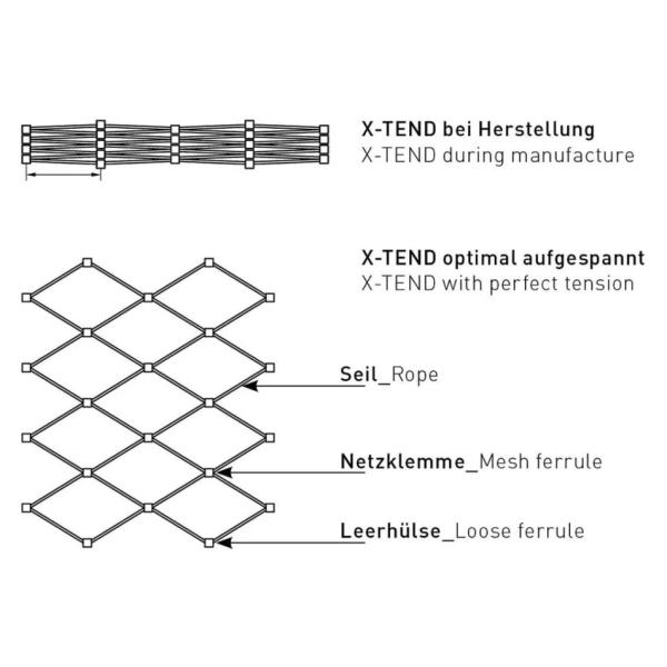 X-TEND is fabricated from high-quality and robust stainless steel cables (material: AISI316). These are linked together by a special method using stainless steel ferrules to form a stressable yet flexible structure for two- or three-dimensional applications. X-TEND keeps its shape indefinitely and requires little maintenance only during its long lifetime.